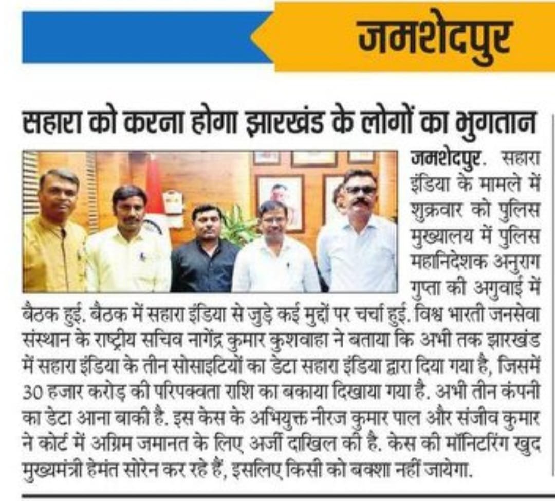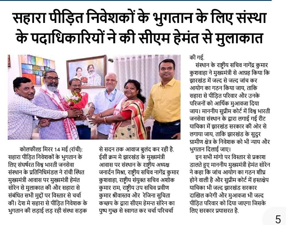झारखंड: विश्व भारती जनसेवा संस्थान ने मुख्यमंत्री से की मुलाकात, सहारा पीड़ितों के लिए जांच आयोग और मुआवजे की मांग