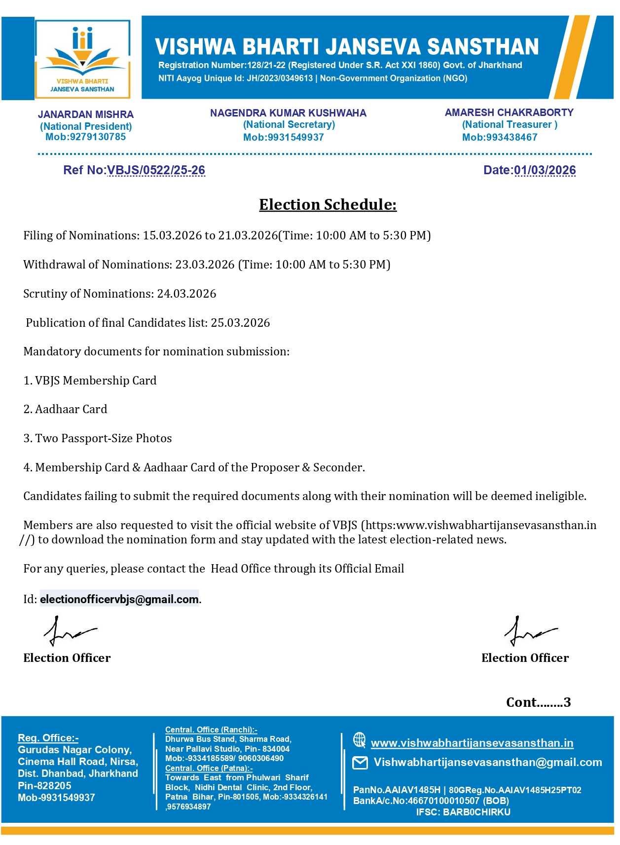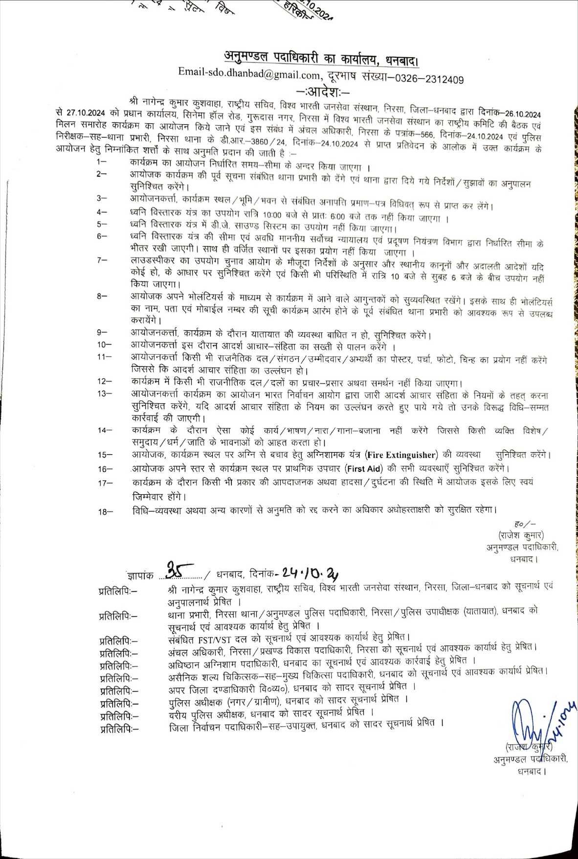 26,27 विश्व भारती जनसेवा संस्थान प्रधान कार्यालय निरसा में 26 ,27 मीटिंग APPROVAL LETTER
