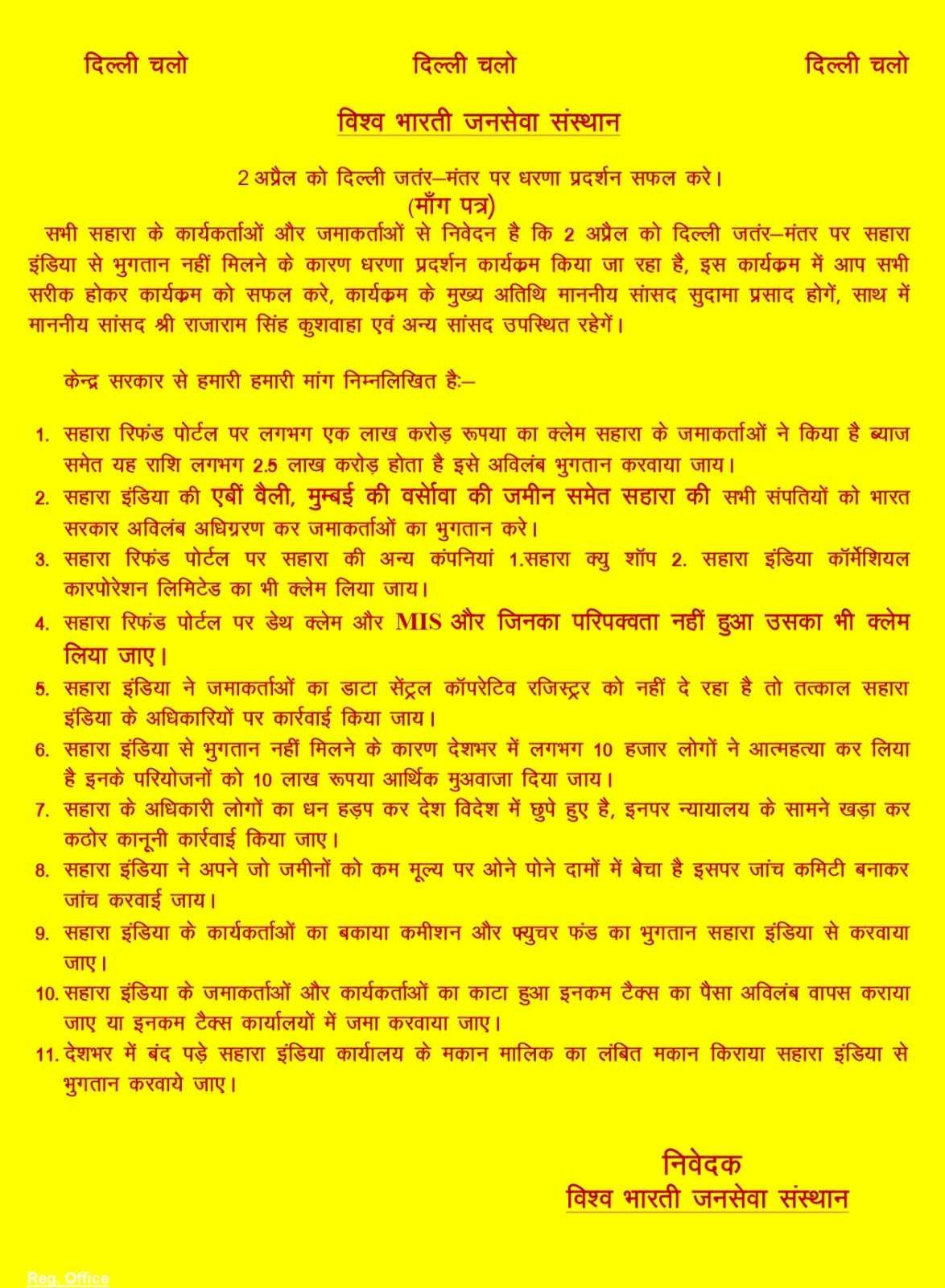 सहारा समूह से 13 करोड़ जमाकर्ताओं के 3 लाख करोड़ रुपये वापस दिलाने हेतु धरना प्रदर्शन