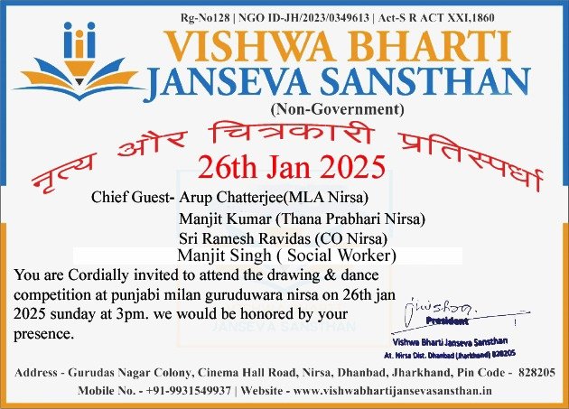 संस्थान के राष्ट्रीय सचिव नागेंद्र कुमार कुशवाहा ने सभी नागरिकों से इस कार्यक्रम में समय पर पहुंचकर अपनी भागीदारी सुनिश्चित करने की अपील की है। कार्यक्रम में निरसा के लोकप्रिय विधायक माननीय अरूप चटर्जी भी शामिल होंगे।